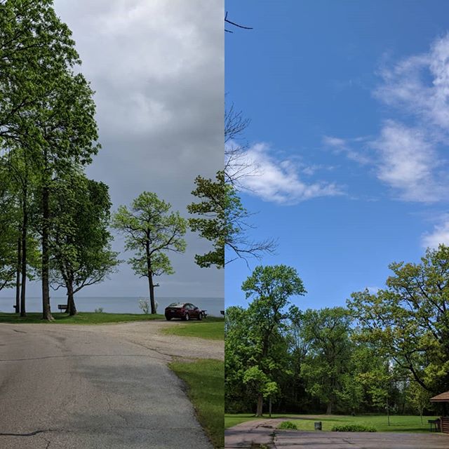 The storm heading out and blue skies behind.
