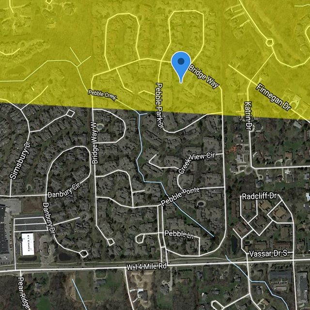 The yellow represents a severe thunderstorm warning. The blue pin is my house, and immediately below is the rest of our condo complex. If I walked 5 minutes out my front door I would be out of the warned area.
