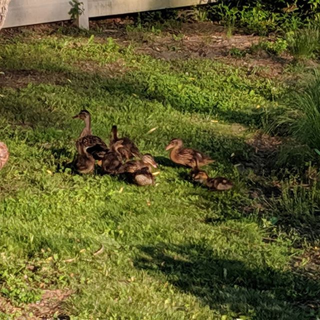 Two duck families by the pond.